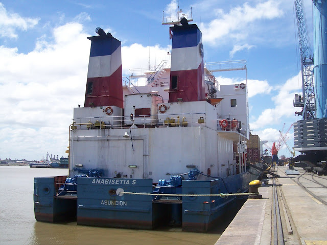 Acá puede verse la popa del buque, con Asunción pintado como puerto de matrícula. En letras soldadas, pintadas del color del casco todavía se lee Buenos Aires.