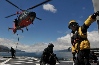 Me llamó la atención ahí el tipo de helo. Porque la Armada no tiene Dauphins. Y resulta que viene a ser un helicóptero chileno, aunque el barco si es el P-46 Gómez Roca, cuyo numeral se ve pintado en cubierta en otra foto de la misma acción.
